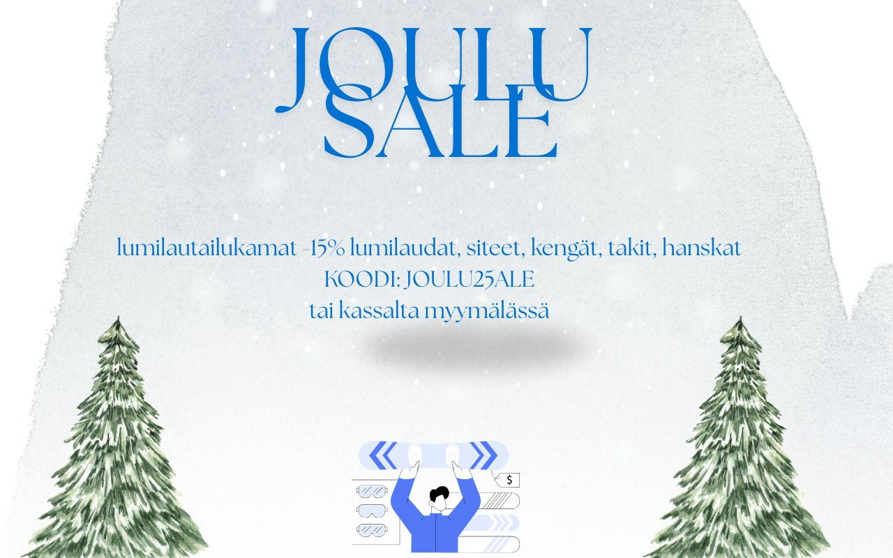 Eli pre-joulu alet käynnistyivät NYT. Koodilla JOULU25ALE saat -15% kaikista lumilaudoista, siteistä, laskukengistä, laskurotseista ja hanskoista.